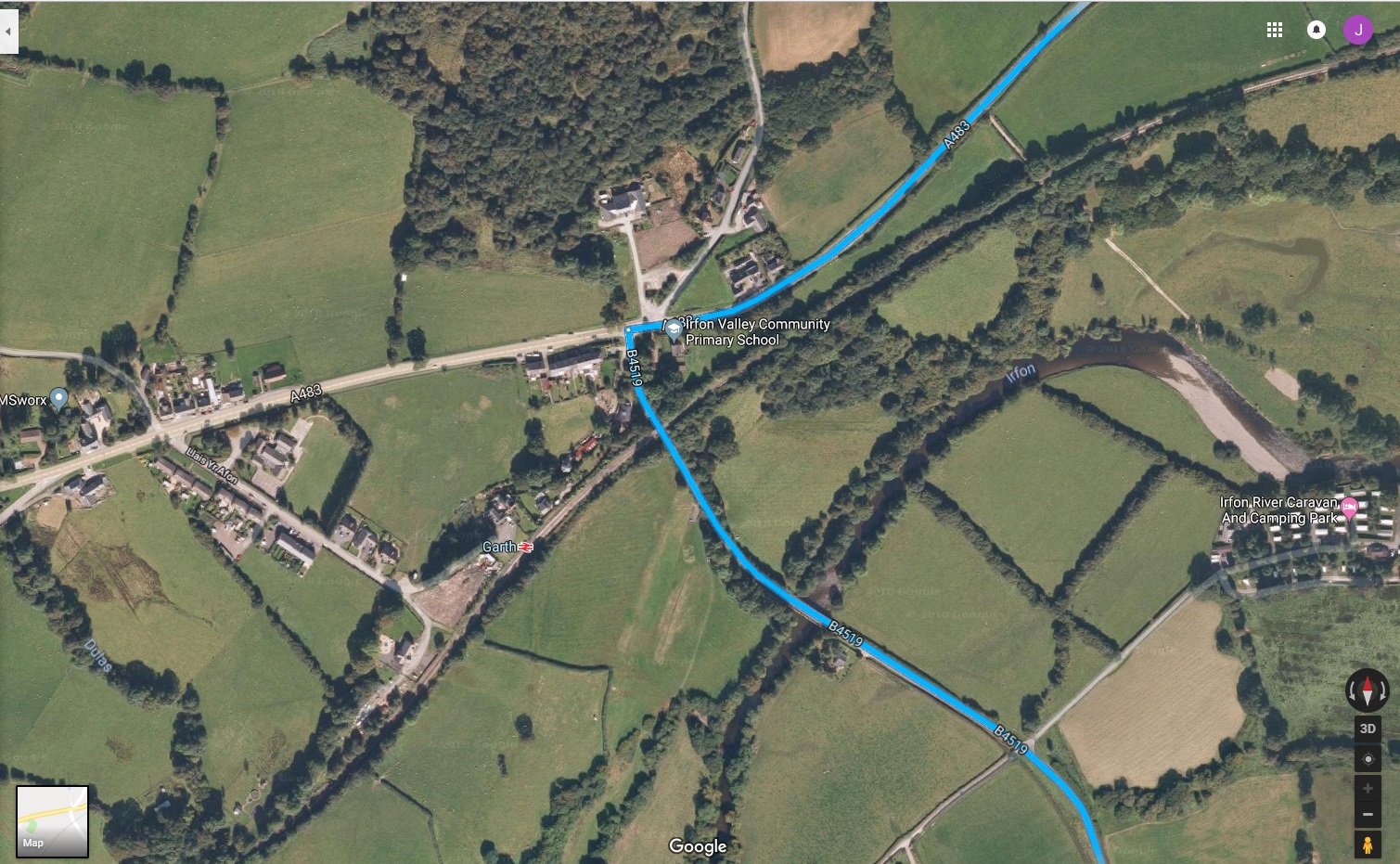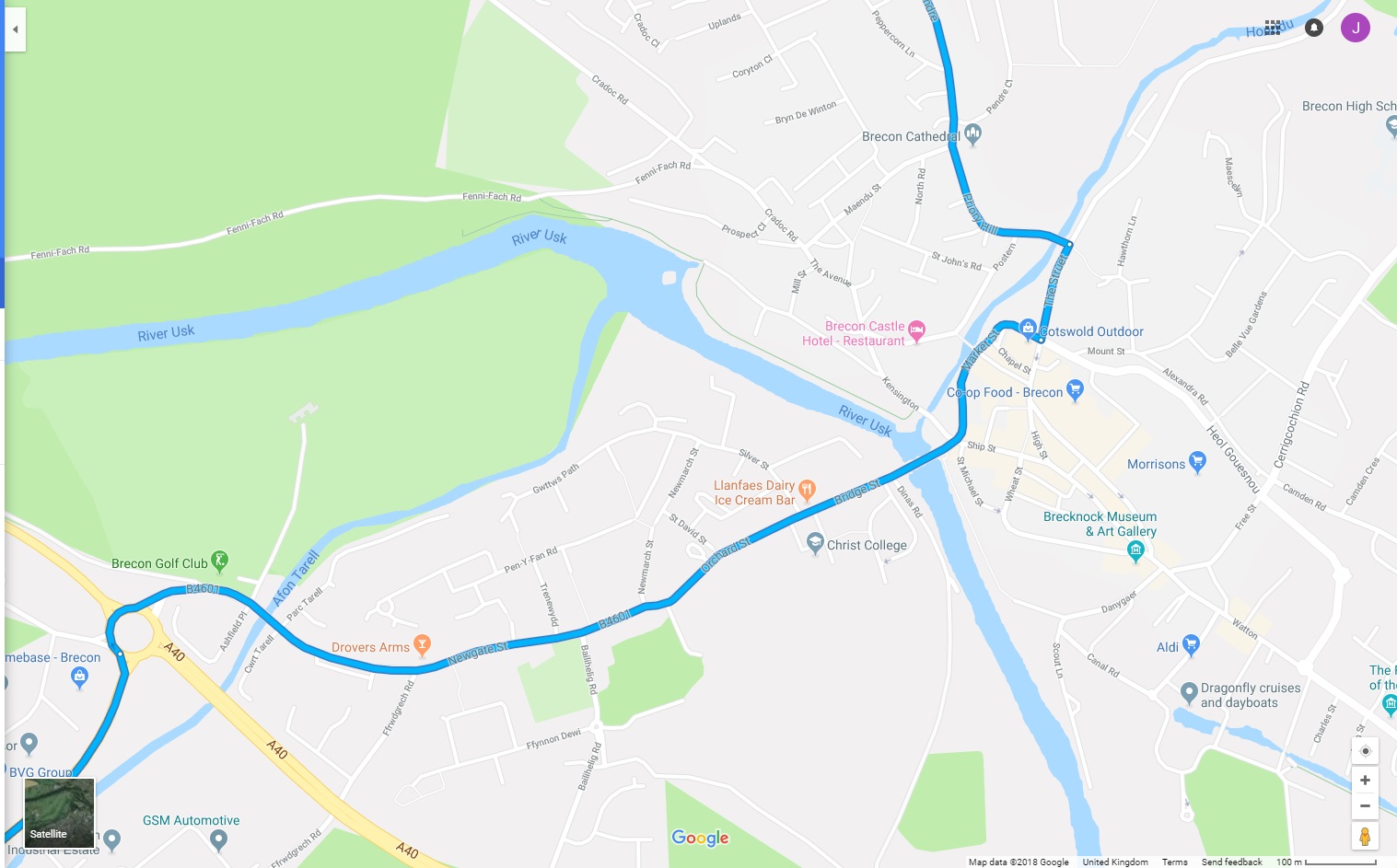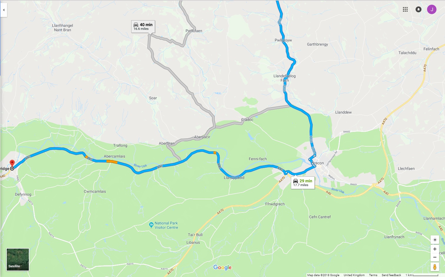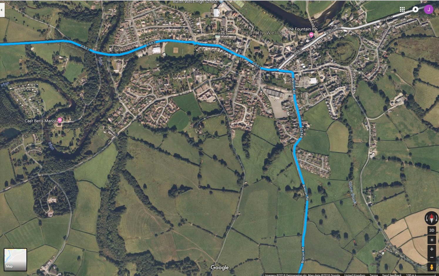 We follow the B4250 into Brecon (note there is an alternate, shorter, route via Cradoc. This is predominantly one car wide with a few bridges that look narrow on street view; so even though it looks pretty, I think we should play it safe and go via Brecon via the route enlarged below.
