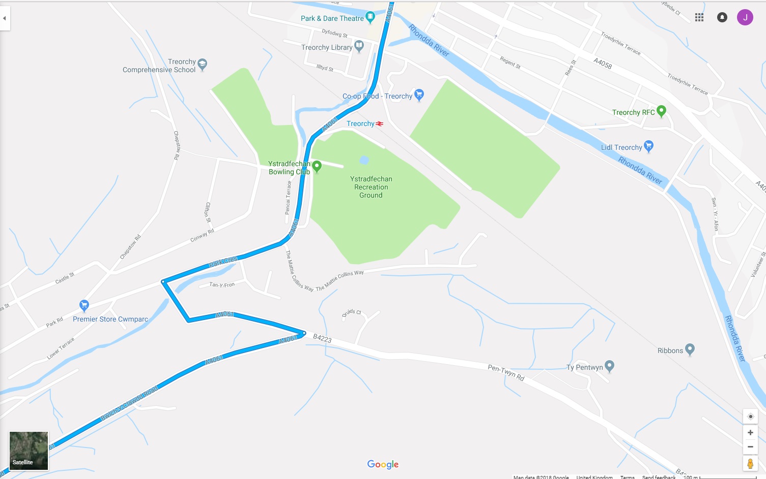 Dropping down into the valley, Treorchy will be on our left . There is a sharp left as we approach the bottom of the valley and enter the town.