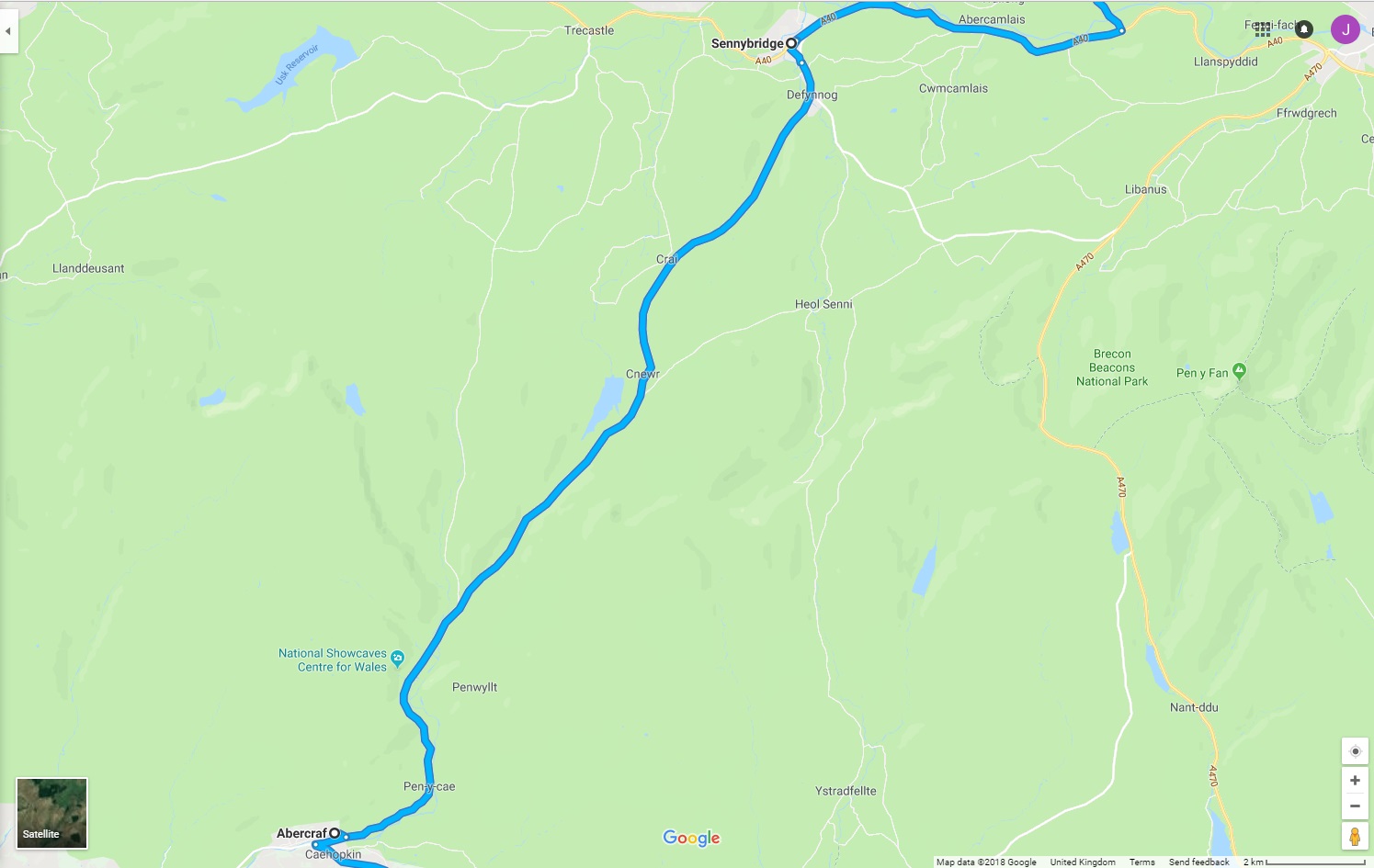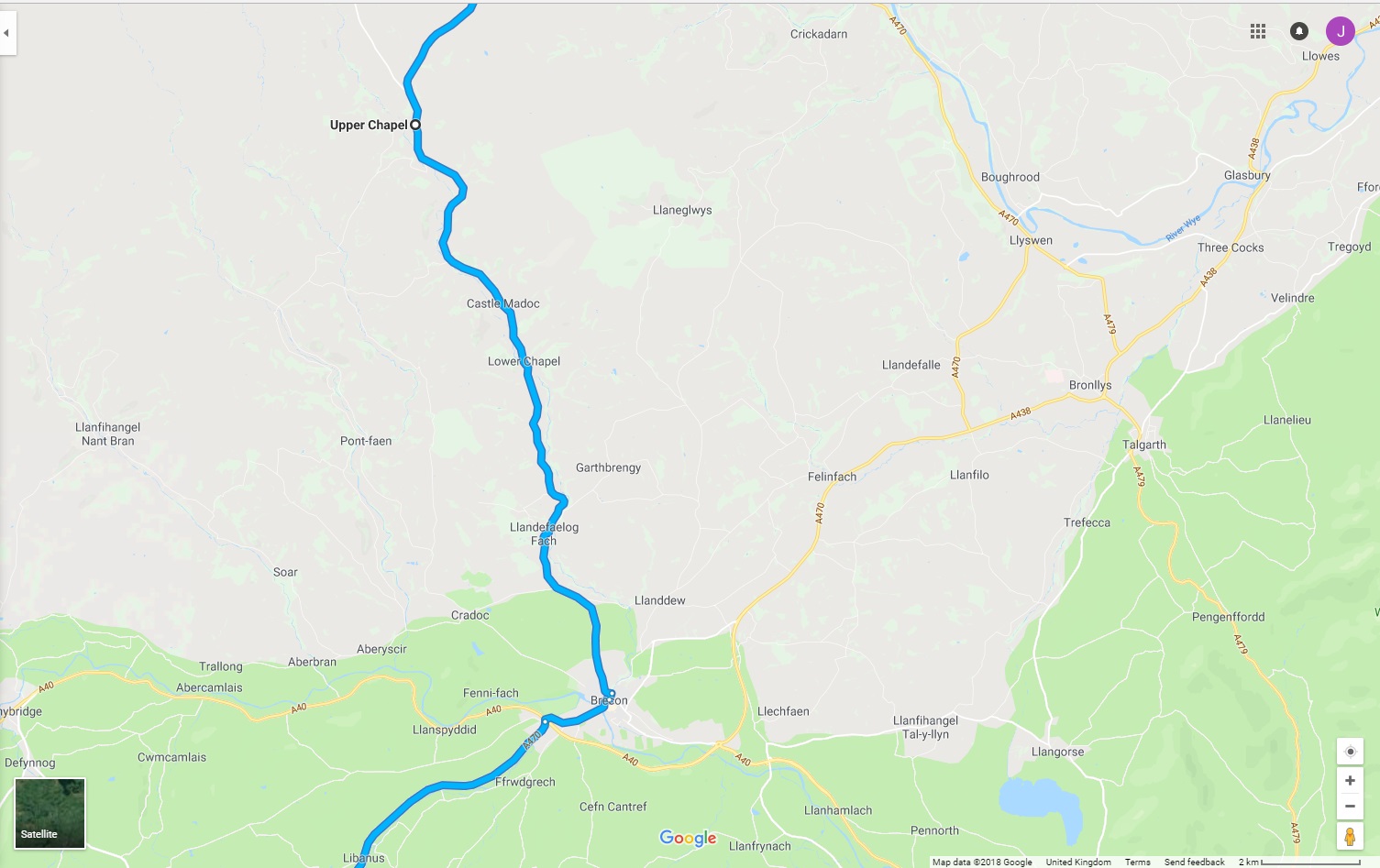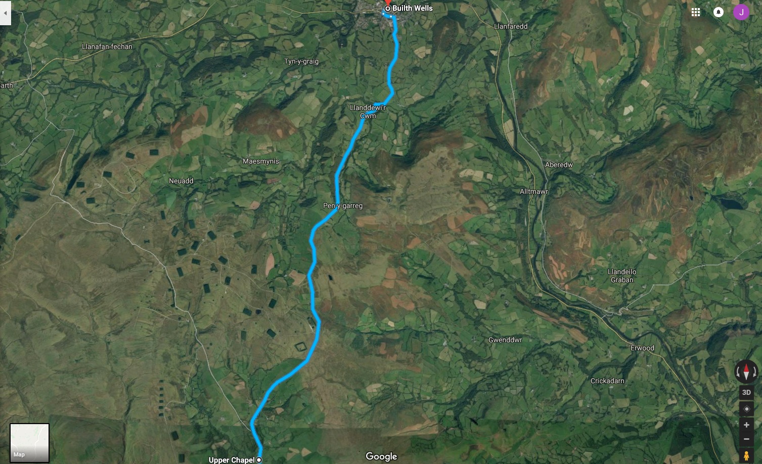 Follow the A470 into Brecon and then take the 3rd exit at the roundabout onto the B4601. Mosey on through the town following the B4061 on the route below…